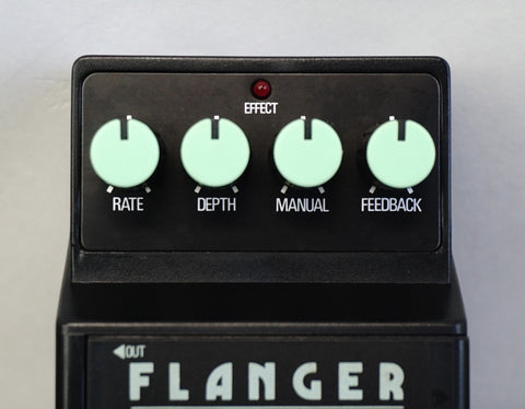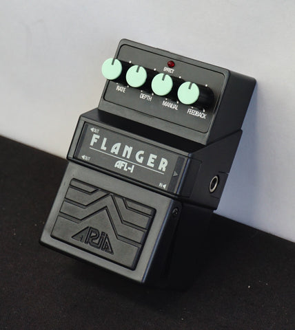 ARIA AFL-1 Flanger 80's Guitar Effects Pedal - Made in Japan The Aria AFL-1 Flanger, produced in Japan in the early 1980s, is an analog BBD-based modulation pedal designed to deliver classic jet-plane flanging and subtle comb-filter effects associated with the golden era of Japanese stompboxes. Featuring straightforward controls for Rate, Depth, Manual, and Feedback (Resonance), the AFL-1 allows precise shaping from gentle movement and chorus-like shimmer through to deep, metallic sweep effects with strong harmonic emphasis. Built during Aria’s sought-after Japanese manufacturing period and sharing circuit design sensibilities with other respected analog flangers of the era, the AFL-1 is valued for its warm modulation character, musical response and solid build quality, making it a desirable vintage pedal for players seeking authentic analog flanging rather than modern digital approximations.