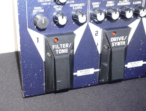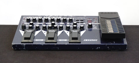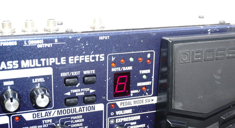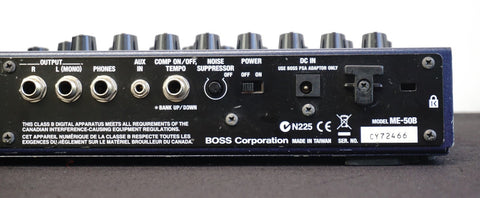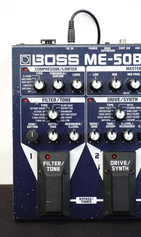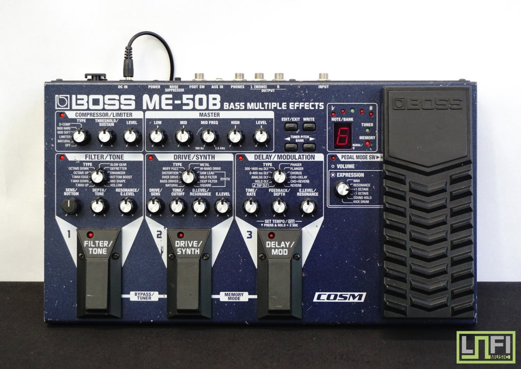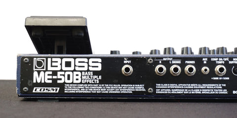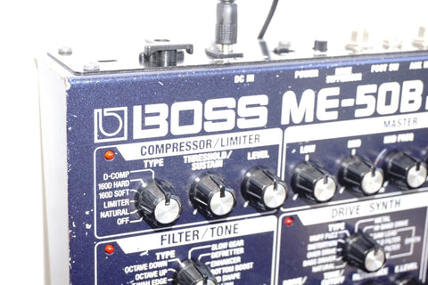 This BOSS ME-50B, released in the 2000s as a floor-based multi-effects unit tailored specifically for bass guitar, packs COSM-driven compressor/limiter, drive/synth, filter/tone, modulation, delay/reverb and a full 3-band EQ into one rugged pedalboard-style chassis — all controlled via dedicated knobs, three footswitches and a built-in expression pedal, avoiding menu diving entirely