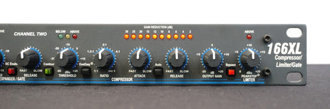 The dbx 166XL, produced throughout the late 1990s into the 2000s, is a dual-channel compressor/limiter/gate known for its musical OverEasy® compression curve, PeakStop® limiting, stereo link capability, and reliable VCA-based dynamics control that made it a staple in both live rigs and project studios.