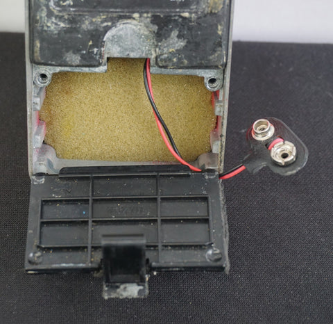 • This unit shows obvious signs of wear on the metal chassis. This includes many marks and nicks. There is some glue on the back where someone has previously had some velcro attached. The serial number sticker is missing. The wear does not detract from its use or functions, it is still a great sounding vintage piece.