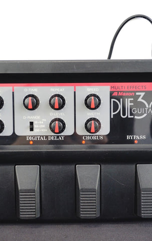 The Maxon PUE3G is a vintage multi-effects guitar pedal from Japan, produced in the 1980s, offering a variety of built-in effects in a compact floor unit; its vintage Japanese build and unusual combination of features make it sought after by gear collectors and players who appreciate rare boutique Japanese effects from the era.