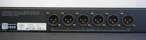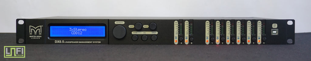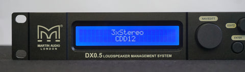 The Martin Audio DX0.5 is a legacy 1U rackmount DSP-based speaker management system featuring 2 balanced XLR inputs and 6 balanced XLR outputs, designed for both passive and powered PA systems.