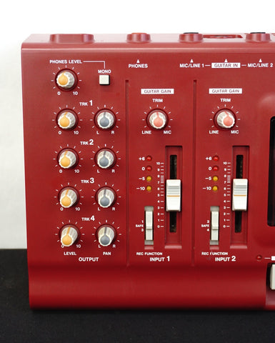 If you're just getting into recording your own music, the Porta 02 MKii is the perfect Portastudio for you. Using the the porta 02 MKii couldn't be easier ... just pop in a standard cassette tape, plug in your instrument, select the track you want and hit "Record". You have four tracks to work with, and you and record two tracks simultaneously. This small and portable machine features 2 1/4" inputs including a Hi-Z guitar input for recording direct, dedicated linear faders, and level and pan controls for each channel as well as a headphone jack with independent level control, stereo/mono switching, and a master L-R output.