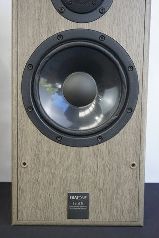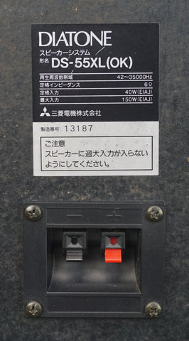 The Diatone DS-55XL are a 2-way bass-reflex bookshelf speaker introduced in 1989 by Mitsubishi/Diatone, designed for high-fidelity performance with advanced materials. Each unit features a R.I. hybrid cone woofer (olefin resin, carbon fibre, and aramid fibre blend) for powerful yet detailed mids and lows, paired with a boron dome tweeter built with Diatone’s D.U.D. (Directly United Diaphragm) technology for extended, precise highs. Each speaker weighs about 11 kg. The speakers are housed in a rigid, shielded cabinet that minimises resonance and interference.
