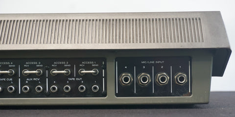 The 244 is basically a 4-channel cassette recorder with DBX noise reduction processors and 4-channel mixer in one portable package. The outer casing is a dark grey plastic two-part moulding, enclosing a rigid metal frame that supports the VU meters, circuitry panels, knobs, switches and cassette mechanics. The left hand mixer section has smart colour coded knobs and both sliders and switches are quiet and smooth in operation. The VU meters are scaled from -20dB to +3dB, with all connection sockets and secured mains cable located behind these on the rear panel. Sockets are all RCA phono types except for the four input jacks and remote punch in/out jack which are standard mono. The right hand cassette section incorporates a 3-motor transport system with FG servo-controlled DC Capstan motor, DC reel motor and (unique to Tascam) a DC control motor that gently moves the head assembly in and out of the tape path. (muzines)