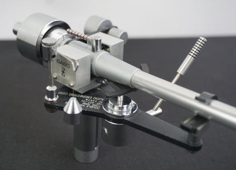 SAEC WE-407/23 Double Knife Edge Static Balanced Vintage HI-FI Tonearm The SAEC WE-407/23 is a high-precision 9-inch dynamic-balance tonearm from Japan, produced in the late 1970s to early 1980s by SAEC (Specialty Audio Equipment Company)—a brand celebrated for its engineering excellence and dual-pivot bearing designs. It features SAEC’s patented double-knife edge bearing system, which uses two precisely aligned pivots to minimise friction and lateral play, resulting in exceptionally stable tracking and channel balance. Condition:
