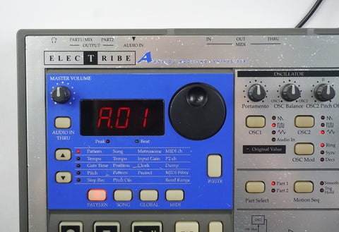 "The ELECTRIBE A is a compact analog modelling synth box that lets you create analog synthesiser, bass, and sound effect sounds simply - just tweak the knob that controls each element of the sound as on an analog synthesiser. Operation is easy and intuitive because the results of moving the knobs are reflected immediately in the sound. The sounds you create on this compact synthesiser can be input to the internal sequencer to create phrases." (KORG)