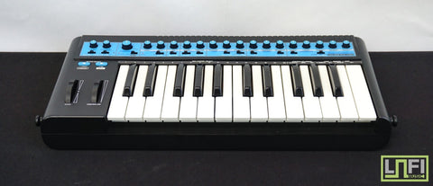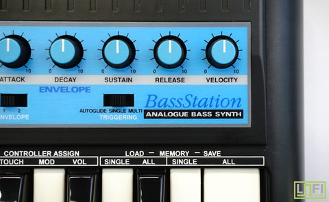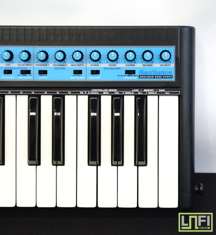 The Novation Bass Station was released in 1993. It uses digitally synchronised analog oscillators to reproduce the sounds of a monophonic dual-osc analog synthesiser with simple and intuitive controls via 17 knobs, 10 switches and 2 Moog-style pitch/mod wheels. The Bass Station can faithfully reproduce analog bass sounds similar to a TB-303, Micromoog or Pro One synthesiser. The small keyboard and monophonic architecture set this keyboard up for strict bassline, lead synth lines, and synth fx. It also transmits MIDI continuous controller data from its pitch/mod wheels, frequency cutoff, resonance, filter modulation depth, env1 attack, decay and env2 attack and decay. (Vintage Synth Explorer)