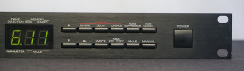 The Roland GS‑6 Digital Guitar Sound System is a 1U rackmount preamp/multi-effect processor released in the late 1980s that combines a robust 8‑mode digital drive section with studio-grade reverb, delay, chorus, noise suppressor, and hum-cancel circuits. Backed by a 16‑bit A/D/A conversion system and 28‑bit DSP at a 32 kHz sampling rate, all sounds are processed digitally with no signal degradation. It stores up to 64 preamp/effect patches, each adjustable via dedicated knobs for Drive, EQ, Master Volume, Reverb (8 types), Delay (1–999 ms), Chorus (4 types), and suppression settings. The front panel features user‑friendly knobs and buttons—no buried menus—while the rear offers MIDI In/Out, RRC foot controller input, and balanced XLR & TS outputs.