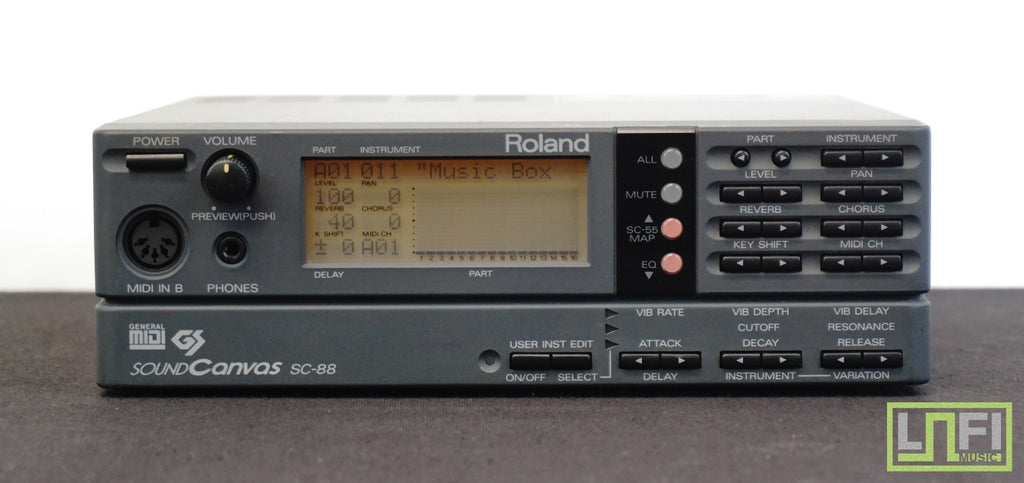The SC-88 a compact, 32 part multitimbral sound module with 64 voices of polyphony. It has 654 high-quality sounds, along with 24 types of drum sound sets. Amongst these sounds are the same ones as the SC-55/55MKII, which means that the SC-88 can correctly play the song data of these modules too. Users can also create their own sounds and drum sets as the SC-88 features 256 user sounds and two user drum sets. It allows you to modify the sounds by tweaking vibrato, filter and envelope and other parameters and also comes with eight types of reverb, eight types of chorus, ten types of delay, and other effects.